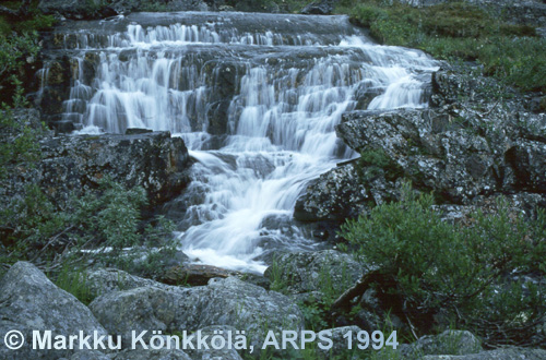| Tšahkaljohkan koski Kilpisjärvi '94 Saanan kaakkoispuolella oleva Tšahkaljohka laskee Tšahkaljavrista Kilpisjärveen, korkeuseroa reilun kilometrin matkalla on 86 metriä. 30x40 , 700 mk