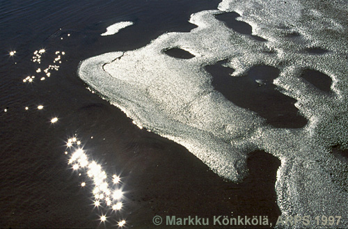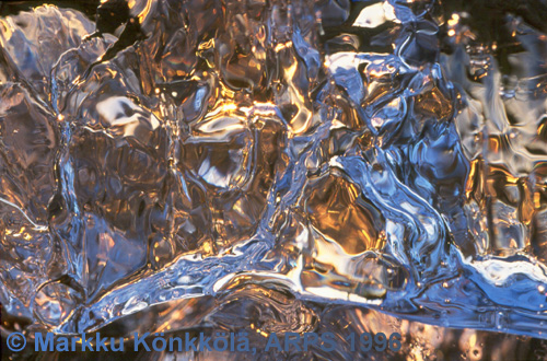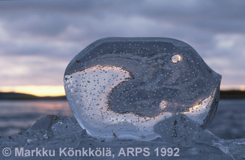 | Jääpala - A Bit of Ice Päijänne, Toivakka 1992 Jouluinen myrsky oli kasannut jäitä rantaan ennen kovia pakkasia. Jääpala toimii linssinä kääntäen takana olevan maiseman ylösalaisin samalla vääristäen horisontin mutkille. Hyväksytty näyttelyihin: IFWP '94 (kolmas sija), Vuoden luontokuvat '94 / Kunniamaininta, 2nd Kajaani International '94, Ars Jok'vars '95, Suomen Kameraseurojen Liiton vuosinäyttely '98. 40x60, 263 € (ALV 47,43 € ) |