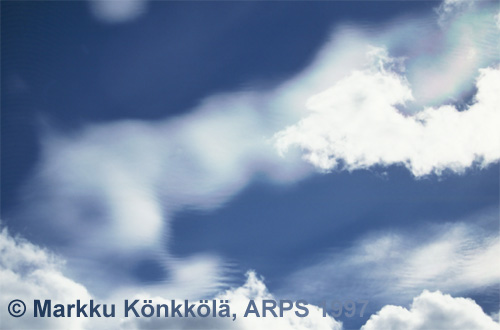 | Väripilviä - Iridescence Clouds Utsjoki 1997 Väripilviä on vaikea havaita, sillä ne näkyvät usein hyvin lähellä aurinkoa. Parhaiten havainnointi onnistuu peittämällä aurinko ja käyttämällä aurinkolaseja. 30x45, 122 € (ALV 22,00 € ) |