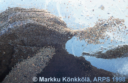 | Hiekkatyrsky - Surf of Sand Saaren kansanpuisto, Tammela 1998 Järven jäät olivat kasautuneet hiekkarantaan korkeaksi valliksi. Alapuolelta katsottuna jää näytti läpikuultavalta ja jäähän tarttunut hiekka muodosti monenlaisia kuvioita. 40x50, 142 € (ALV 25,61 € ) |